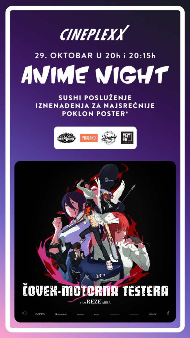 Prvi put na velikom platnu, Chainsaw Man stiže u eksplozivnoj akcionoj avanturi koja nastavlja globalni anime fenomen! Popularni Anime night koji donosi poklone i ukuse Japana, ponovo će obradovati fanove ovog žanra u bioskopu Cineplexx Novi Sad u sredu, 29. oktobra u 20 časova. Ulaznice su u prodaji.