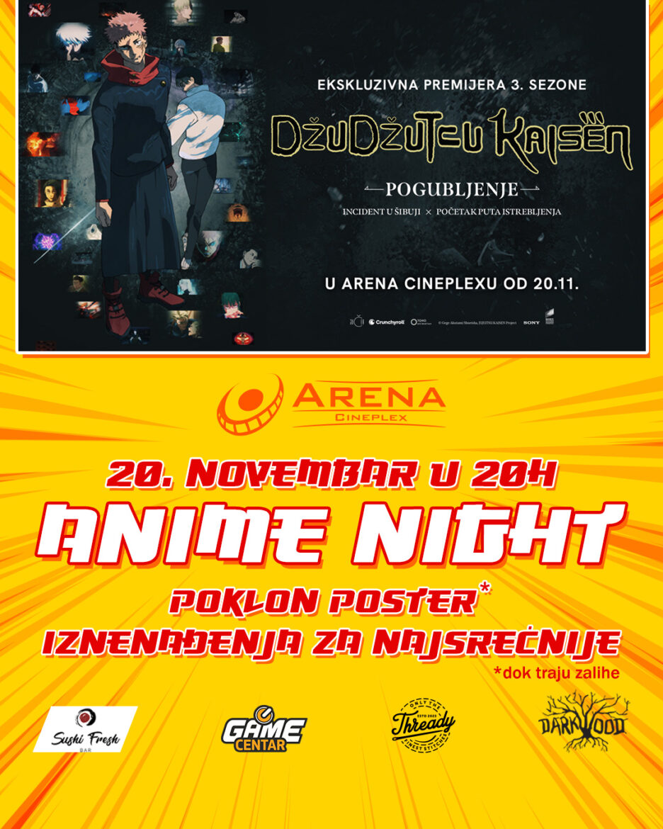 Najsurovija borba iz „Šibuja incidenta” stiže na veliko platno, na Anime Night u bioskop Arena Cineplex! Prirpemite se za tematske poklone i anime avanturu uz “Džudžucu Kaisen: Pogubljenje” u četvrtak, 20. novembra od 20 časova. Ulaznice su u prodaji!