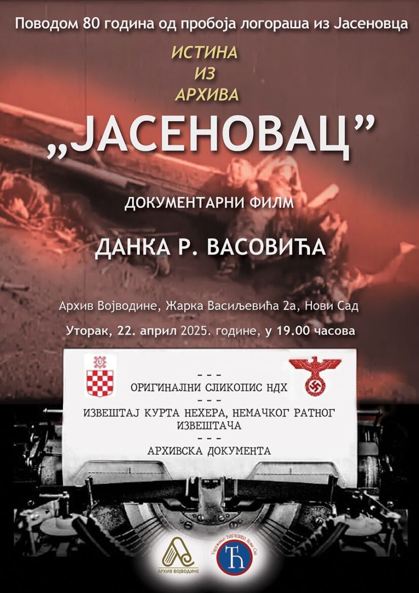 Savetnik gradonačelnika Novog Sada Petar Đurđev je u Arhivu Vojvodine prisustvovao srpskoj premijeri dokumentarnog filma „Jasenovac” povodom obeležavanja Dana sećanja na žrtve Holokausta, genocida i drugih žrtava fašizma u Drugom svetskom ratu i 80 godina od proboja logoraša iz Jasenovca, u organizaciji Udruženja „Ćirilica” iz Novog Sada i Arhiva Vojvodine.