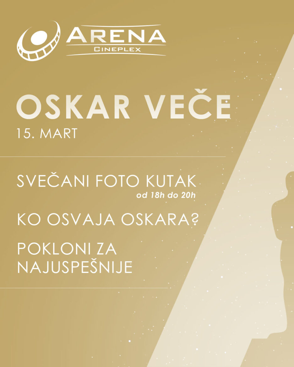 Uoči dodele najprestižnijih filmskih nagrada, u nedelju, 15. marta, bioskop Arena postaje mala holivudska scena. Pored filmova sa redovnog repertoara, na programu su i tri potencijalna oskarovca: „Bugonija“, „Sentimentalna vrednost“ i animirani film „Arko“. Od 18 do 20 časova, uz crveni tepih, biće upriličen svečani foto kutak, u kojem će posetioci bioskopa moći da se fotografišu sa replikom statue Oskara i pokažu svoj holivudski glam stajling.