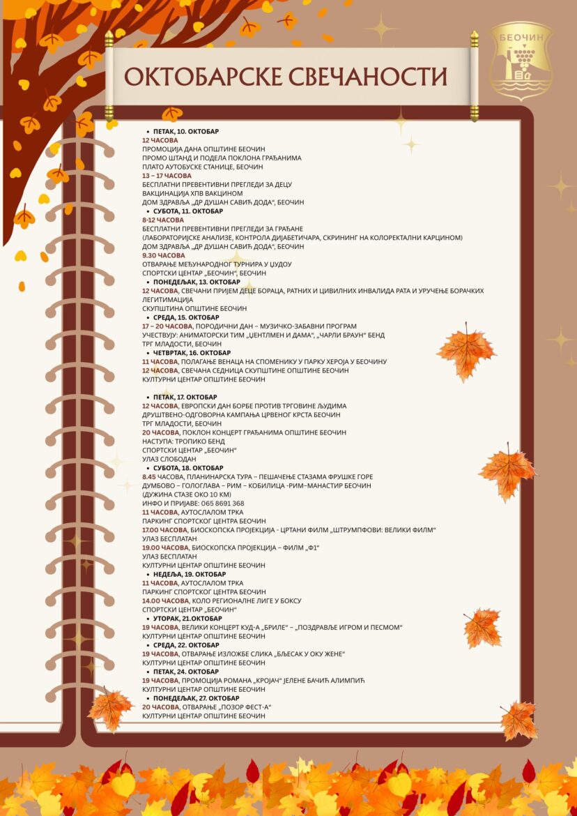 Oktobarske svečanosti biće najavljene podelom programa i poklona građanima opštine Beočin na promo štandu, u petak u 12 časova na platou centralne autobuske stanice u Beočinu, a istog dana od 13 do 17 časova odeljenje pedijatrije Doma zdravlja „Dr Dušan Savić Doda“ sprovodi info dan za decu i roditelje gde će se vršiti besplatni preventivni pregledi, edukacija na temu prevencije oboljenja koje izaziva HPV virus kao i besplatna vakcinacija HPV vakcinom.
