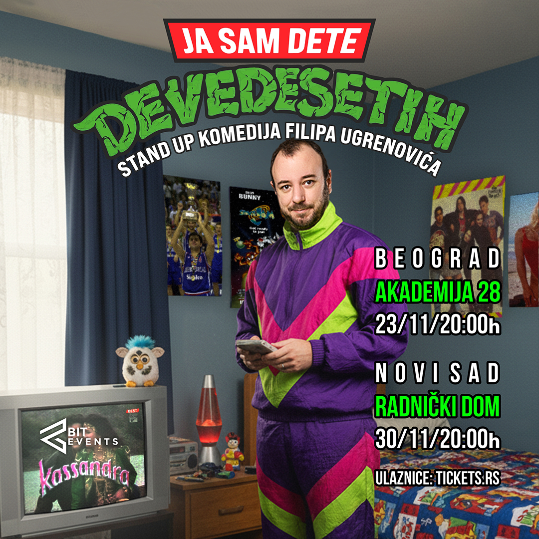 Ako ste odrasli uz „Minti” žvake, BB show i „Mućke”, ako ste maštali o sto maraka i čekali da vas Mič Bjukenon spase iz talasa – predstava „Ja sam dete devedesetih” je vaš obavezni povratak u detinjstvo! Ova duhovita, topla i nimalo tragična priča o jednoj generaciji koja je sanjala veliko, a radovala se malim stvarima, stiže u Beograd, u Akademiju 28, u nedelju, 23. novembra u 20 časova, a potom u Radnički dom u Novom Sadu u nedelju, 30. novembra u 20 časova.