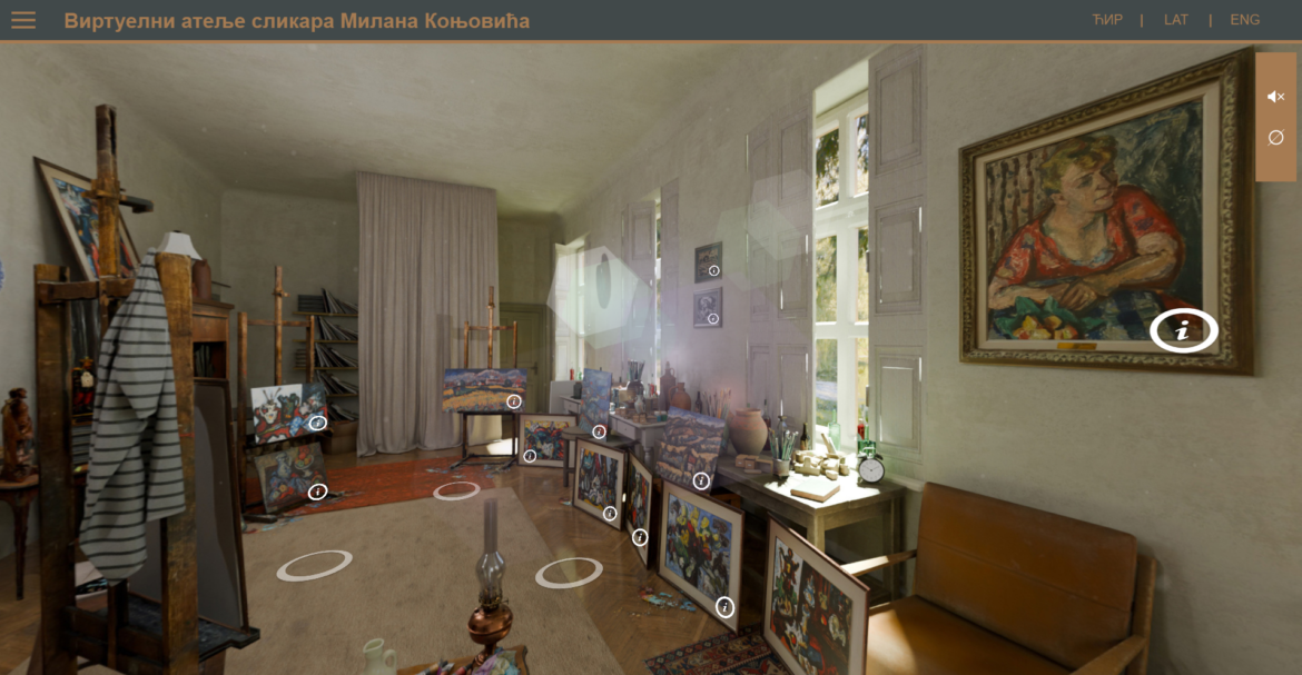 U okviru izložbe Ateljei umetnika kreirani su digitalni sadržaji koji obuhvataju virtuelni atelje slikara Milana Konjovića, kao i AI animacije slika Devojka na studencu Uroša Predića i Autoportret u kafani Stevana Aleksića, prikazane u proširenoj stvarnosti (AR – Augmented Reality). Ovi sadržaji oživljavaju prostore zabeležene na starim fotografijama i vizuelno interpretiraju simboliku umetničkih dela. Više o spoju umetnosti i savremenih tehnologija saznaćete na predavanju Virtuelne ture i AI animacije: Oživljavanje kulturnog nasleđa putem digitalnih tehnologija.