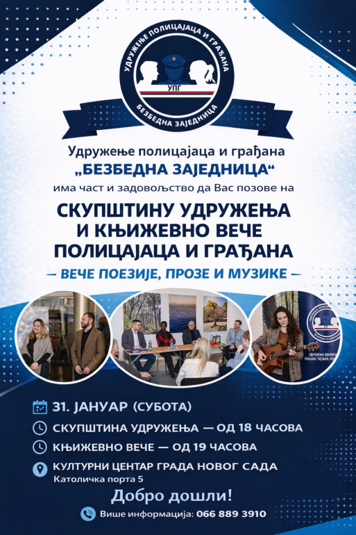 Udruženje policajaca i građana „Bezbedna zajednica“ organizuje Skupštinu Udruženja i treće tradicionalno književno veče policajaca i građana, koje će biti održano u subotu, 31. januara, u Kulturnom centru Grada Novog Sada (Katolička porta 5).