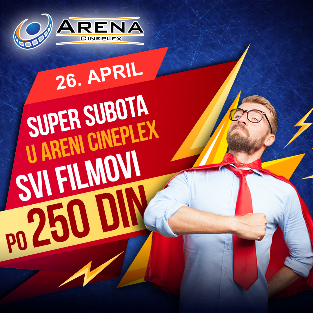 Arena Cineplex poklanja svojim posetiocima Super subotu, 26. aprila kada će, prvi put u ovoj godini, tokom celog dana cena ulaznica za sve filmove iznositi 250 dinara. Ulaznice su u prodaji na blagajnama bioskopa, dok zbog velikog interesovanja rezervacija nije moguća.