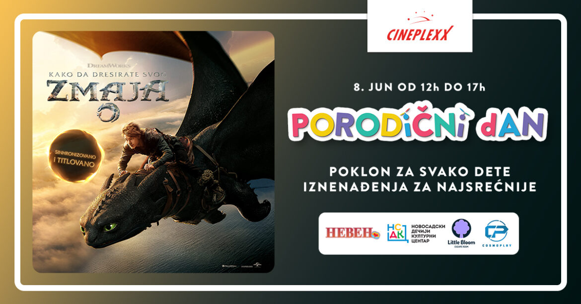 Popularna franšiza „Kako da dresirate svog zmaja”, sada kao igrana verzija filma, stiže 8. juna na Porodični dan u bioskop Cineplexx Novi Sad i u periodu od 12 do 17 časova donosi poklone i magiju na velikom platnu. Ulaznice su u prodaji!